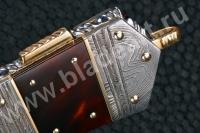 Рукоять: плашки из золота 585 пробы; все больстеры из нержвающего дамаска собственного изготовления: заклепки, осевой штифт, замок back lock, подложка под шайбу открывания клинка, разделительные перемычки между дамаском и вставками из ископаемой черепахи и петля для подвеса на торце ножа выполнены из золота 585 пробы; спинка ножа изготовлена из нержавеющей стали 416 и украшена орнаментом "filework"